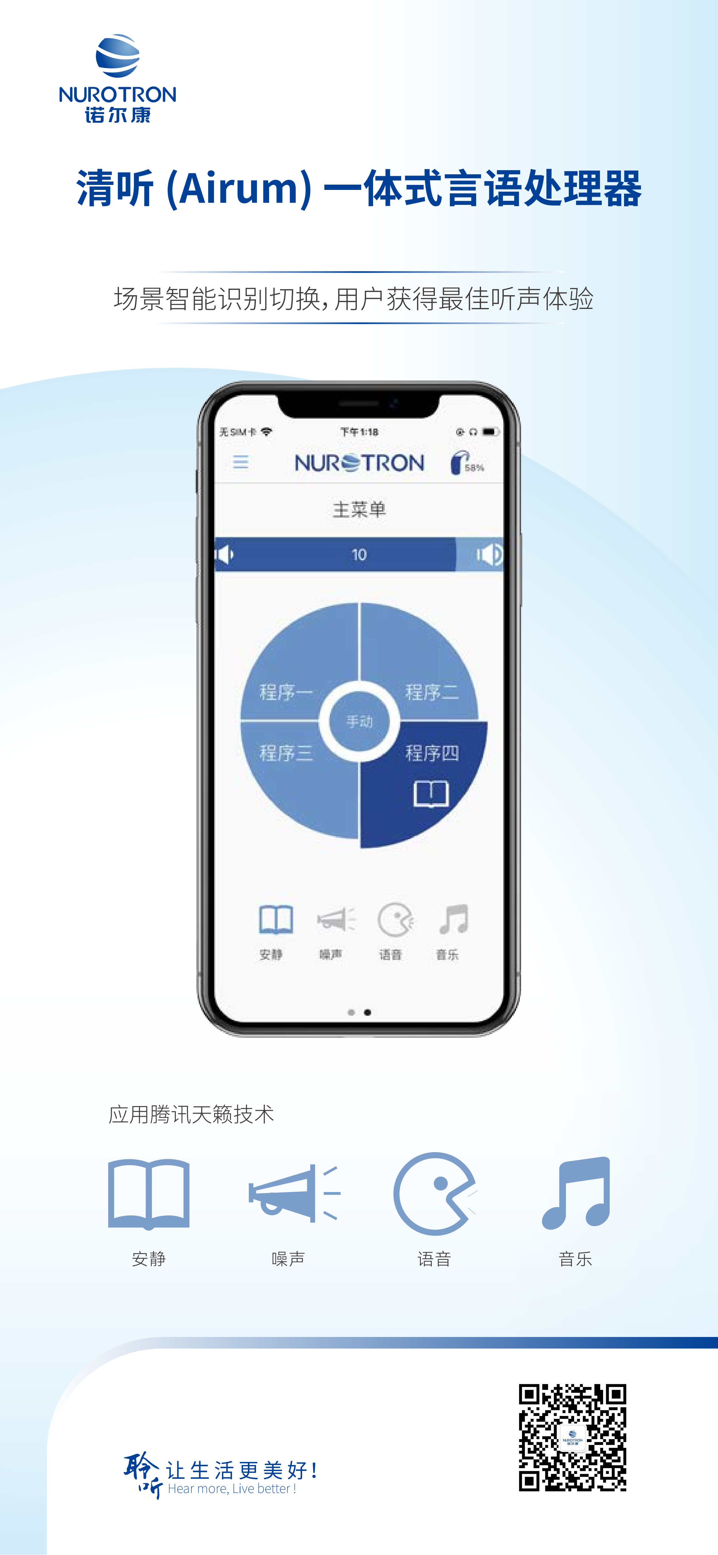 諾爾康第四代言語處理器,融合18年研發(fā)智慧及產(chǎn)品經(jīng)驗,10.8mm纖薄機(jī)身,輕松隱于耳后發(fā)絲間,電池分體式設(shè)計,24小時電量續(xù)航,搭載智能降噪技術(shù),諾音App即時操控,讓您隨時隨地,自在聆聽。